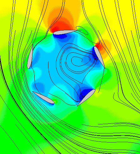 This picture is a CP image of a turbine with fixed foils. It shows how forces are generated on limited parts of the circumflex.